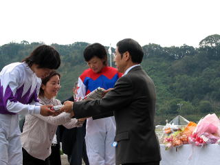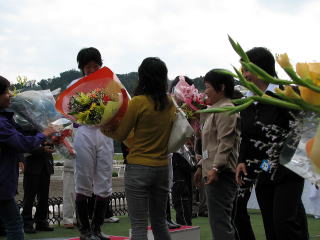 天候にも恵まれて、たくさんのファンがセレモニーに参加してくれました。表彰ステージ前には別府真衣ちゃんの姉妹&いとこさん、香川から駆けつけた森井美香ちゃんのお友達の姿がみられました。調騎会会長&副会長、馬主会会長、真衣ちゃんの勝負服をデザインされた東京のファンの方などが壇上に。プレゼントされた花束もたくさんで、華やかなセレモニーになりました。