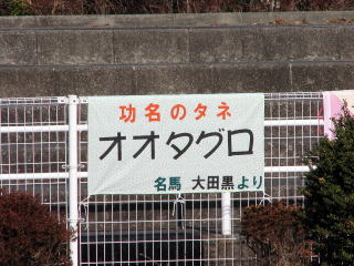 | オオタグロこぼれ話 まだまだ子供で、ものすごくおとなしいそうです。 顔をなでられても全然嫌がらずにず〜っとなすがままだそうです。 「功名のタネ」: 「お命のお持ち帰りこそ功名の種にござりまする。」というお千代さんの言葉から、 オオタグロはじめ、全ての競走馬にはレース後無事に帰ってきて欲しい。 高知競馬にはこの厳しい時代を生き延びて、将来高知県に競馬文化の華を開かせて欲しい。 という願いを込めて・・・ (「なんかわかりにく〜い」といいつつも横断幕を作ってくださったリボンさん、感謝です!) サポートKRAでは現在オオタグログッズを製作中らしいです。 オオタグロの次走までに間に合うといいですね。(1/29) |