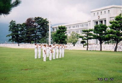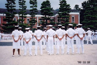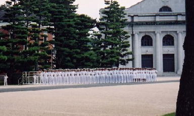 江田島の朝礼を見学するために、朝5時半にたたき起こされたワタクシたちSP軍団の教師集団。民主主義教育にどっぷりつかり、命令されることを嫌うクセが抜けないが、前日の呉総監部研修で認識も新たになったようだ。