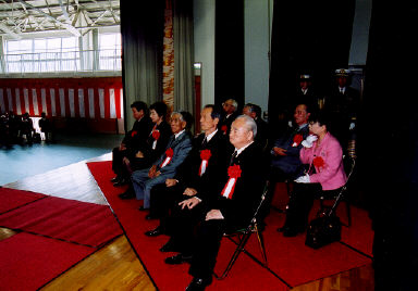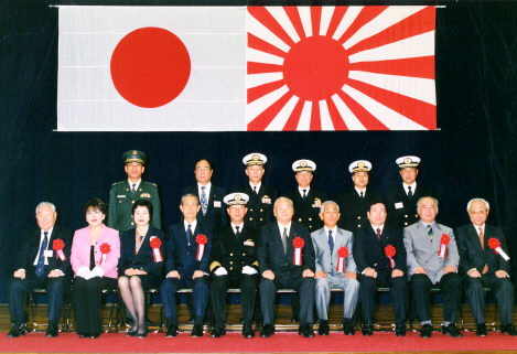 | 晴れやかなじ受賞者の面々 | その通りです。自衛艦が入港すれば、仕事も家庭も放りっぱなしで「土佐鶴」両手に、港に駆けつけました。モーターボートをチャーターしてお見送りもしました。Tバック姿で女に飢えた海軍さんに目の保養もさせました。広報用のどでかい看板も自費で作りました。募集事務所と間違われることもしばしばでした。 機関紙の記事をとるために各地の基地へ取材旅行。金も使い果たしました。隊員募集をするために、したくもない学習塾もたちあげ、塾生を強制的に入隊試験を受けさせました。呆れた亭主はワタクシに離婚をちらつかせています。呉総監からの感謝状を取るか離婚をとるか!感謝状のほうがいいに決まってます。海上自衛隊はその信頼を獲得しましたが、ワタクシは亭主の信頼を放棄することになりました。何事にも犠牲は必要です。 |