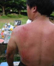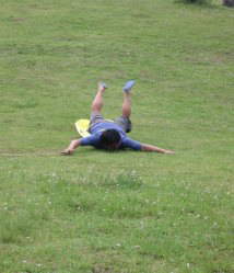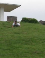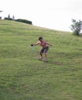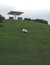 宴の盛り上がりとともに、出来あがってきたまっとさんは滑りたそう・・・でもスケボー無いし、芝滑りに来ていたお姉ちゃんにプラボード借りるも滑り悪し! こりゃあKEI呼ぶしかないろー(笑)KEI軍団も呼び出され、スケボーが出てきた、とたんに始まった! 知る人は知る!ご存知「伝説の丘ドロップ大会」 「今日は暑い!」を連発していた、まっとさんはTシャツを脱いでしまった。。。ナゼかボードにリーシュ付けて、頂上からのドロップ開始!結果はごらんのとうりでございます。 そろそろ出来あがってきたKEIも、新品らしきシャツを泥だらけにしていたが、まだまだヒヨッコである。 |
